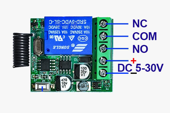 Реле выключателя имеет 3 контакта стандартного назначения NO, NC и Com. Эти контакты не связаны с питающим напряжением и выведены на клеммник. Это позволяет осуществлять коммутацию переменного напряжения до 220 вольт, или постоянного напряжения до 30 вольт.